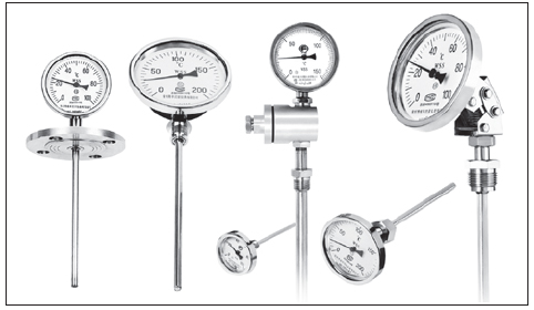 測(cè)量氣體和液體的溫度。與玻璃溫度計(jì)相比,它具有無(wú)汞損壞、讀數(shù)清晰、堅(jiān)固耐用的優(yōu)點(diǎn)。我生產(chǎn)多用途雙金屬溫度計(jì),規(guī)格品種齊全,質(zhì)量穩(wěn)定可靠,可廣泛應(yīng)用于工業(yè)、農(nóng)業(yè)、國(guó)防和科研領(lǐng)域的各個(gè)部門(mén)。雙金屬溫度計(jì)結(jié)構(gòu)特點(diǎn)和工作原理雙金屬 溫度計(jì)(以下簡(jiǎn)稱溫度計(jì))使用螺旋加熱器雙金屬板作為溫度傳感元件,并將其安裝在保護(hù)套中,一端固定(固定端),另一端(自由端)連接到薄軸上,軸端帶有指針。當(dāng)溫度變化時(shí),溫度傳感元件的自由端立即旋轉(zhuǎn),并通過(guò)細(xì)軸驅(qū)動(dòng)指針以指示刻度盤(pán)上的溫度變化。直行溫度計(jì)通過(guò)轉(zhuǎn)向傳動(dòng)機(jī)構(gòu)驅(qū)動(dòng)指針。外殼材料包括鋼板、鑄造鋁合金和不銹鋼板??烧{(diào)角度溫度計(jì)的頭部可借助波紋管、轉(zhuǎn)角機(jī)構(gòu)和其他部件從角度調(diào)整為直線或從直線調(diào)整為角度。